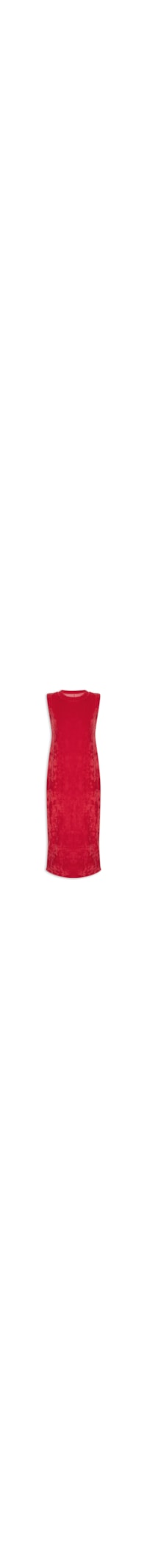 O vestido vermelho é confeccionado em veludo com baixa elasticidade. A peça solta ao corpo possui decote redondo, alças largas, pences na parte frontal na área do busto, comprimento midi, e fenda posterior.
