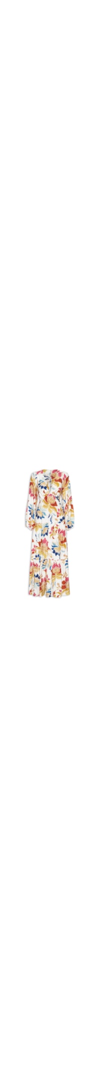 O vestido branco é confeccionado em tecido leve sem elasticidade. A peça solta ao corpo possui decote V profundo, mangas longas com elástico embutido nos punhos, recortes com efeito franzido, recorte posterior vazado com tira alongada cruzada para amarração e ajuste, estampa floral em cores contrastantes e comprimento longo.