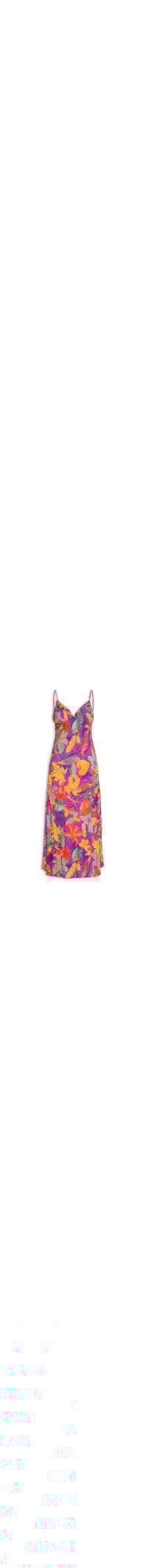 O vestido roxo é confeccionado em tecido leve sem elasticidade. A peça solta ao corpo possui decote V profundo, alças finas com regulagem, recorte na altura do busto com franzidos, estampa floral em cores contrastantes e comprimento longo.