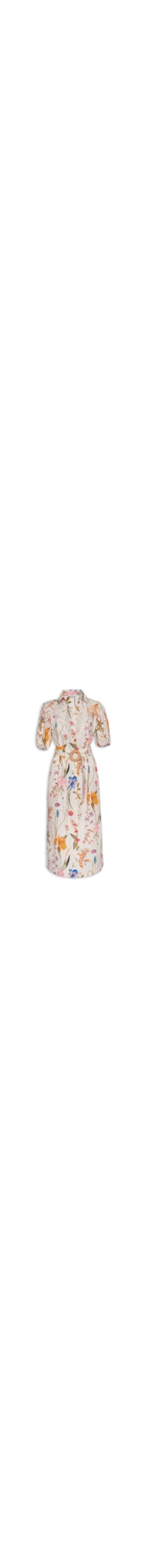 O vestido bege é confeccionado em tecido leve sem elasticidade. A peça solta ao corpo, possui decote em V com colarinho, mangas curtas bufantes, bordado richelieu floral na parte frontal do busto com leve transparência, bolsos frontais embutidos, recorte posterior com pregas, estampa floral em cores contrastantes, comprimento midi e fechamento frontal por botões forrados. Acompanha cinto médio em mesmo tecido, possui ilhóses para regulagem e fechamento frontal por fivela redonda com miçangas aplicadas.