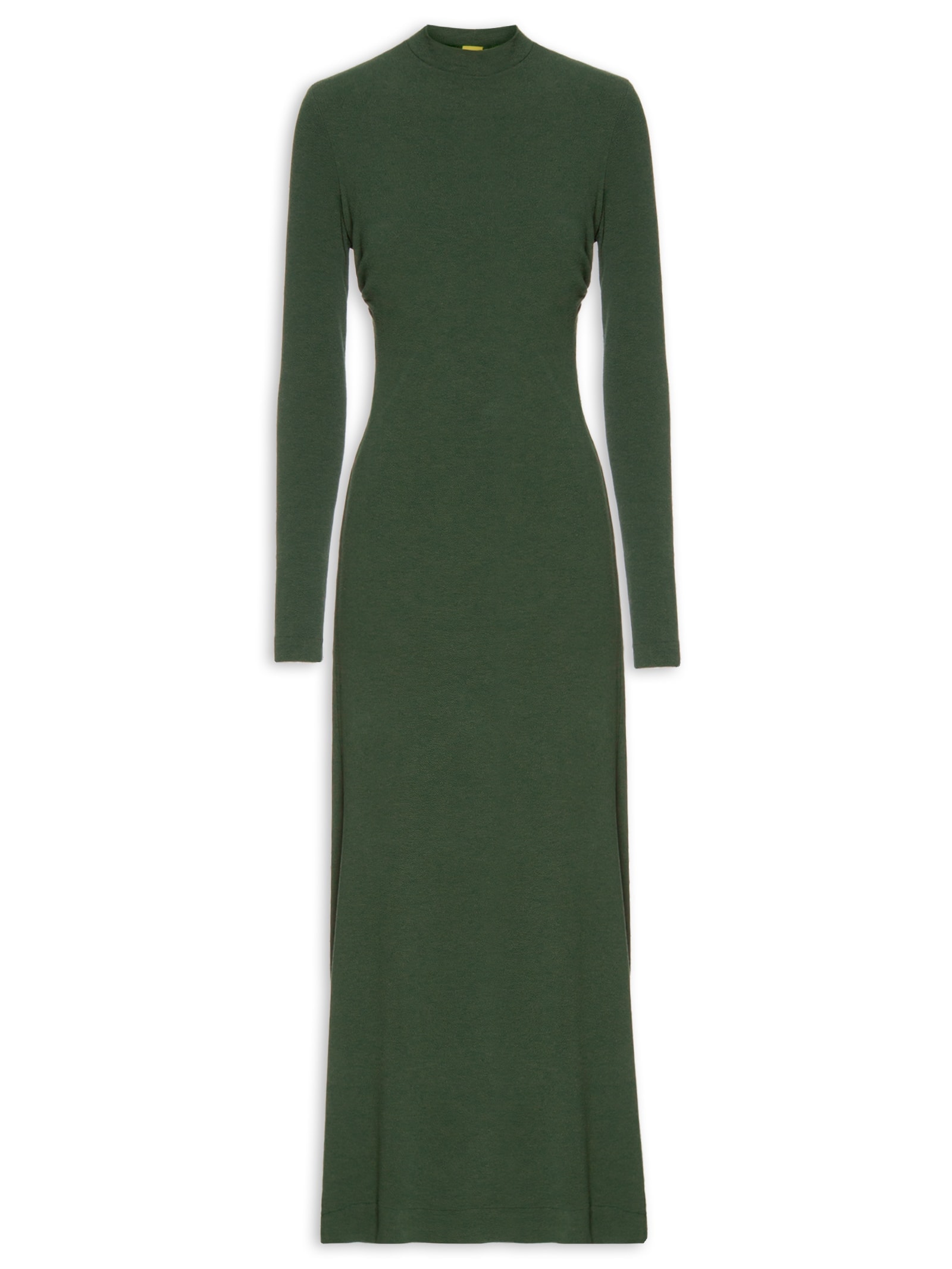 O vestido verde é confeccionado em malha creponada com alta elasticidade. A peça justa ao corpo possui gola alta, mangas longas, recorte posterior vazado e comprimento midi.