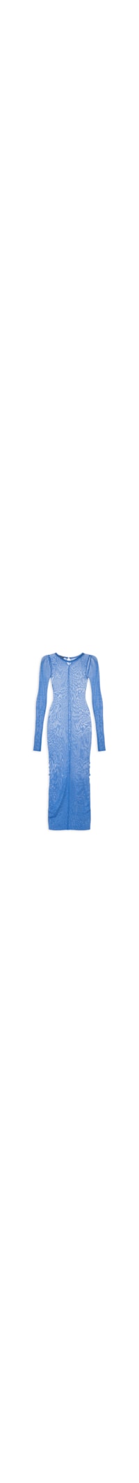 O vestido azul é confeccionado em tricot. A peça justa ao corpo possui decote redondo, mangas longas, recorte posterior e frontal com nervura, transparência e comprimento midi.