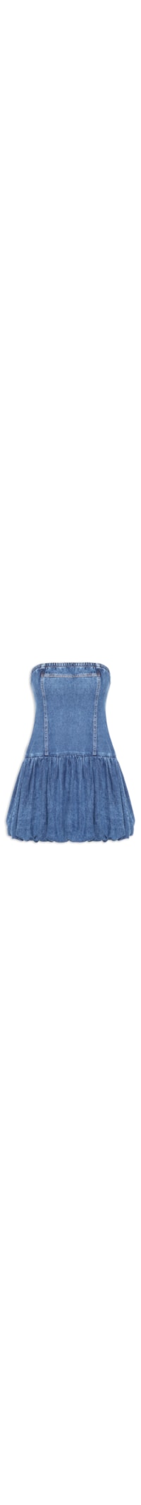 O vestido azul é confeccionado em sarja com lavagem jeans sem elasticidade. A peça justa ao busto e solta ao quadril de modelo tomara que caia possui decote reto com elástico embutido, recortes frontais e posteriores, saia balonê, comprimento curto, acabamento pespontado em cor contrastante, tag da marca metalizada aplicada na parte posterior e fechamento posterior por zíper.