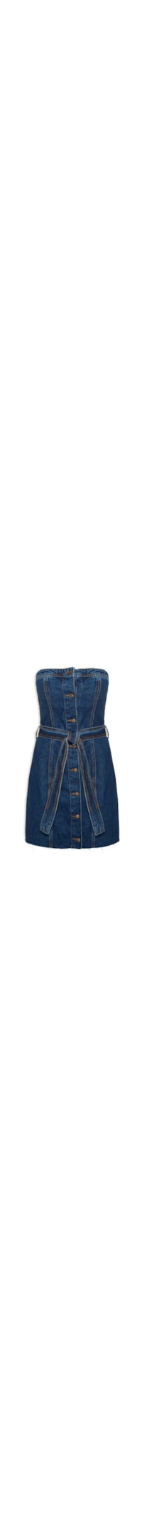 O vestido azul marinho é confeccionado em sarja com lavagem em jeans com baixa elasticidade. A peça justa ao corpo de modelo tomara que caia possui decote reto, recortes posteriores e frontais, passantes aplicados na parte posterior na altura da cintura, recortes posteriores e frontais, sem bojo, barra com acabamento em corte a fio, comprimento curto e fechamento frontal por botões. Acompanha cinto para uso opcional.