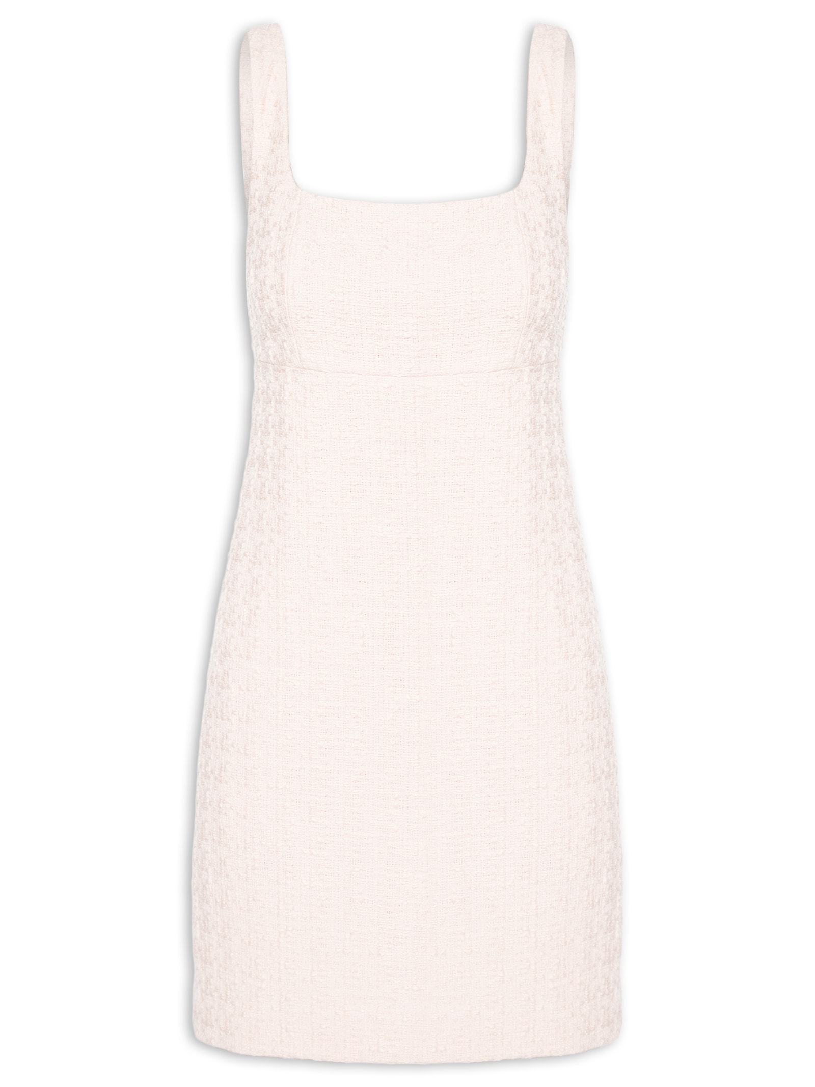 O vestido rosa é confeccionado em tweed sem elasticidade. A peça justa ao corpo possui decote quadrado, alças médias, pences frontais, recorte posterior vazado com fechamento em colchetes, forro, comprimento curto e fechamento posterior por zíper invisível.