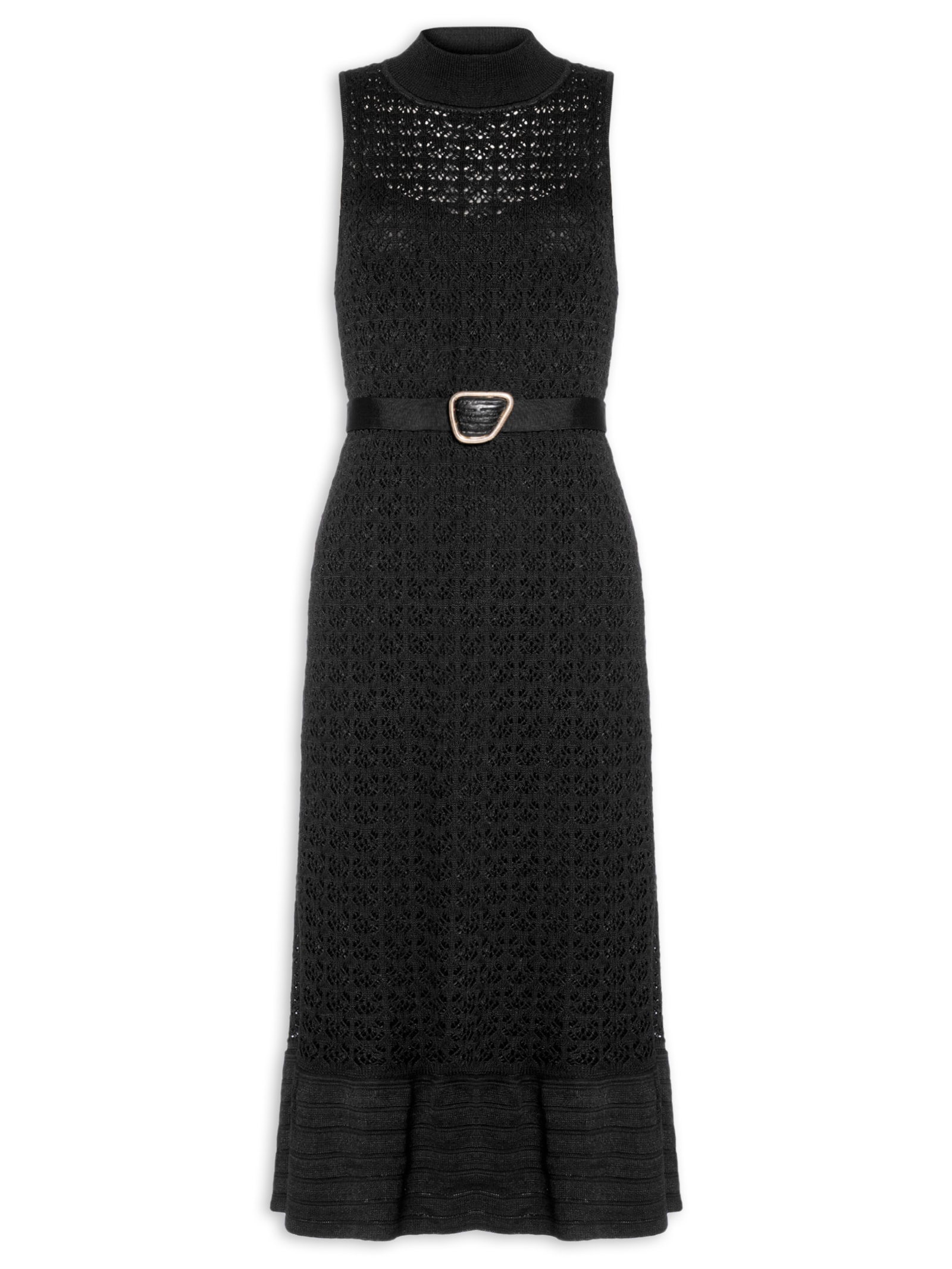 O vestido preto é confeccionado em tricot com alta elasticidade. A peça justa ao busto e solta ao comprimento possui gola alta, alças largas, cavas regulares, detalhes vazados na trama, recorte com efeito de babado na parra, tag da marca metalizada aplicada na parte posterior, comprimento curto e forro em tecido leve com alças finas, decote arredondado e comprimento midi. Acompanha cinto de espessura média, elástico embutido e de aviamento metalizado com detalhe de pedra aplicada na cor preta.