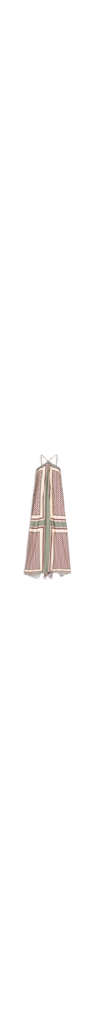 O vestido marrom é confeccionado em tecido leve sem elasticidade. A peça solta ao corpo possui decote halter, alças finas, recortes posteriores, estampa geométrica, comprimento midi e fechamento posterior por amarração.