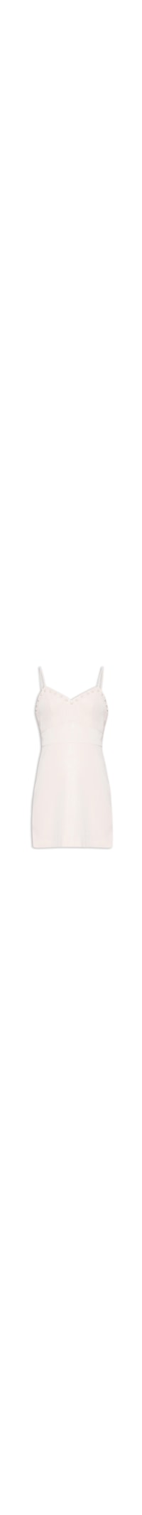 O vestido bege é confeccionado em material sintético sem elasticidade. A peça justa ao busto e solta no comprimento possui decote V, alças finas, recortes frontais, pences posteriores, aplicação superior de esferas metálicas, forro superior, sem bojo, barra com corte a fio, comprimento curto e fechamento posterior por zíper invisível.