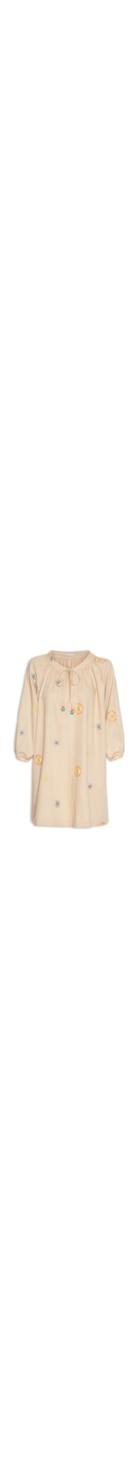 O vestido bege é confeccionado em tecido leve com toque de linho sem elasticidade. A peça solta ao corpo possui decote V com detalhe de tiras alongadas e ponteiras esféricas de cores contrastantes para amarração, mangas 3/4 raglan com elástico embutido na barra, aplicação de bordados florais em cores contrastantes, comprimento curto e fechamento frontal por botão.
