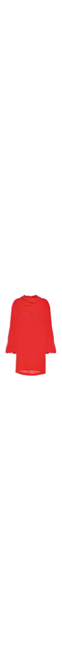O vestido vermelho é confeccionado em tecido leve sem elasticidade. A peça solta ao corpo possui gola alta com faixas alongadas para amarração posterior, recorte posterior, mangas longas com ajuste nos punhos, tag da marca aplicada em metal na parte frontal na altura da barra, leve transparência e comprimento curto.