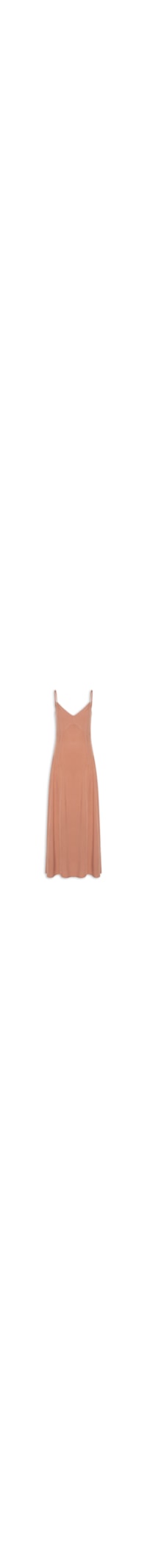 O vestido marrom é confeccionada em tecido leve sem elasticidade. A peça solta ao corpo possui decote em V, alças finas com regulagem na parte posterior, recortes frontais e posteriores, cavas regulares, comprimento longo e fechamento posterior por zíper invisível.