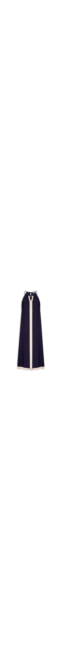 O vestido azul é confeccionado em tecido leve sem elasticidade. A peça solta ao corpo possui decote halter, cavas estendidas, alças finas alongadas para amarração posterior, detalhe em cor contrastante ao longo da peça e na barra, recorte posterior vazado e comprimento longo.