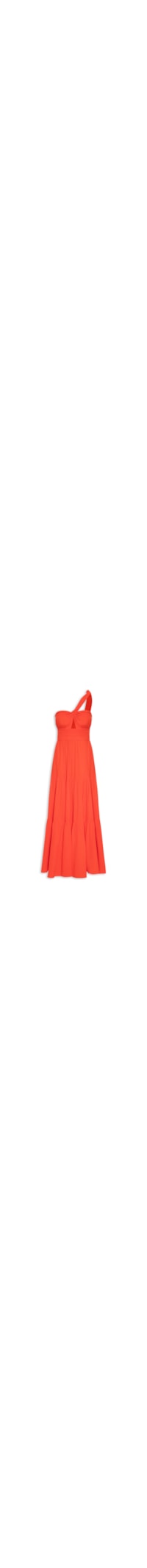 O vestido vermelho é confeccionado em crepe sem elasticidade. A peça justa no busto e solta no corpo possui decote ombro único, alça em tiras médias diagonais estendidas para amarração, recorte frontal vazado com detalhes drapeados, recorte posterior em lastex, cintura com recorte com detalhes laterais de franzidos e parte frontal e posterior com drapeados, recortes em camadas com detalhes de franzidos, forro, comprimento longo e fechamento posterior por zíper invisível.
