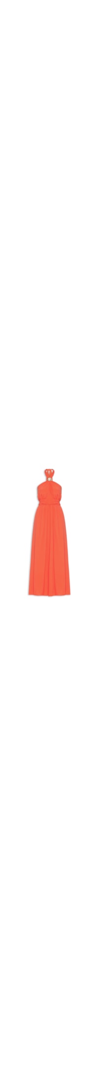 O vestido vermelho é confeccionado em tecido leve sem elasticidade. A peça solta no corpo possui decote halter com recorte vazado e aviamento dourado aplicado, tiras alongadas para amarração posterior, cavas estendidas, recorte de tecido sobreposto na cintura, decote posterior vazado, comprimento longo e fechamento posterior por amarração e zíper invisível.