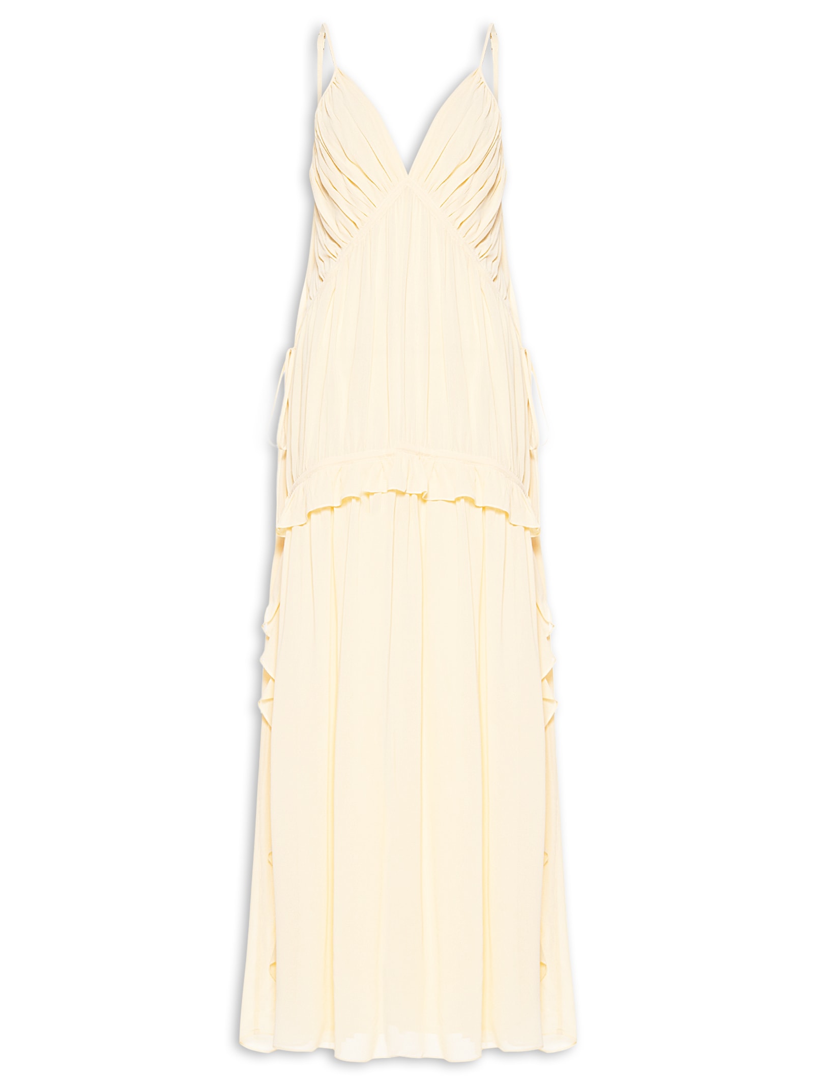 O vestido amarelo é confeccionado em crepe sem elasticidade. A peça solta ao corpo possui decote em V, alças finas com regulagem na parte posterior, cavas regulares, tira fina parte frontal e posterior para ajuste lateral por amarração, detalhe franzido com efeito drapeado na parte frontal, forro, tira alongada aplicada para efeito de babado, recortes, comprimento longo e fechamento posterior por botão.