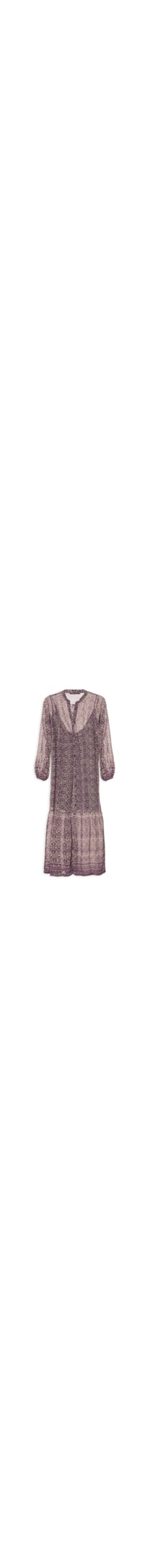 O vestido roxo é confeccionado em tecido leve sem elasticidade. A peça solta ao corpo possui colarinho mandarim com recorte vazado em V e tiras estendidas para amarração com ponteiras em miçangas, mangas longas com elástico embutido nos punhos, recorte com detalhes de franzidos na altura do busto, leve transparência, meio forro, estampa floral em cor contrastante, fendas laterais, comprimento longo e fechamento frontal por botões.