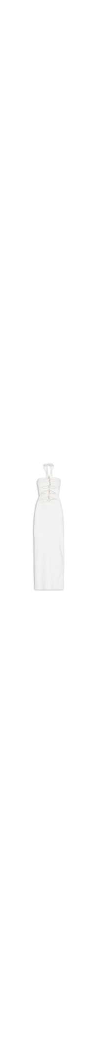 O vestido branco é confeccionada em malha com baixa elasticidade. A peça justa ao corpo possui decote coração, alças finas com amarração na parte posterior, alças finas com regulagem na parte posterior, recortes vazados na parte frontal com detalhe de aplicação de pedras em cor contrastante, fenda posterior, comprimento longo e fechamento posterior por zíper invisível.