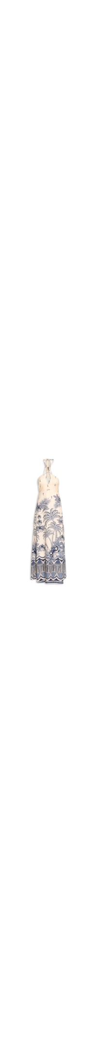 O vestido azul é confeccionado em tecido leve sem elasticidade. A peça solta ao corpo possui decote halter, alças finas, cavas alongadas, recortes vazados nas partes frontal e posterior, recortes em lastex na parte posterior, aviamento metalizado em formato figurativo de peixe aplicado na altura do decote, estampa figurativa em cor contrastante e comprimento longo.
