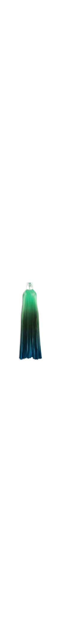 O vestido verde é confeccionado em tecido leve com superfície acetinada plissada sem elasticidade. A peça solta ao corpo possui decote halter, alças finas estendidas com ponteiras de miçangas para amarração posterior, efeito degradê em cores contrastantes, forro na parte frontal do busto e comprimento longo.