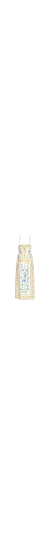 O vestido azul é confeccionado por tecido leve sem elasticidade. A peça solta ao corpo possui decote quadrado com detalhe em renda, alças finas com ajuste, fendas laterais, decote posterior com elástico embutido, mix de estampas em cores contrastantes e comprimento longo.