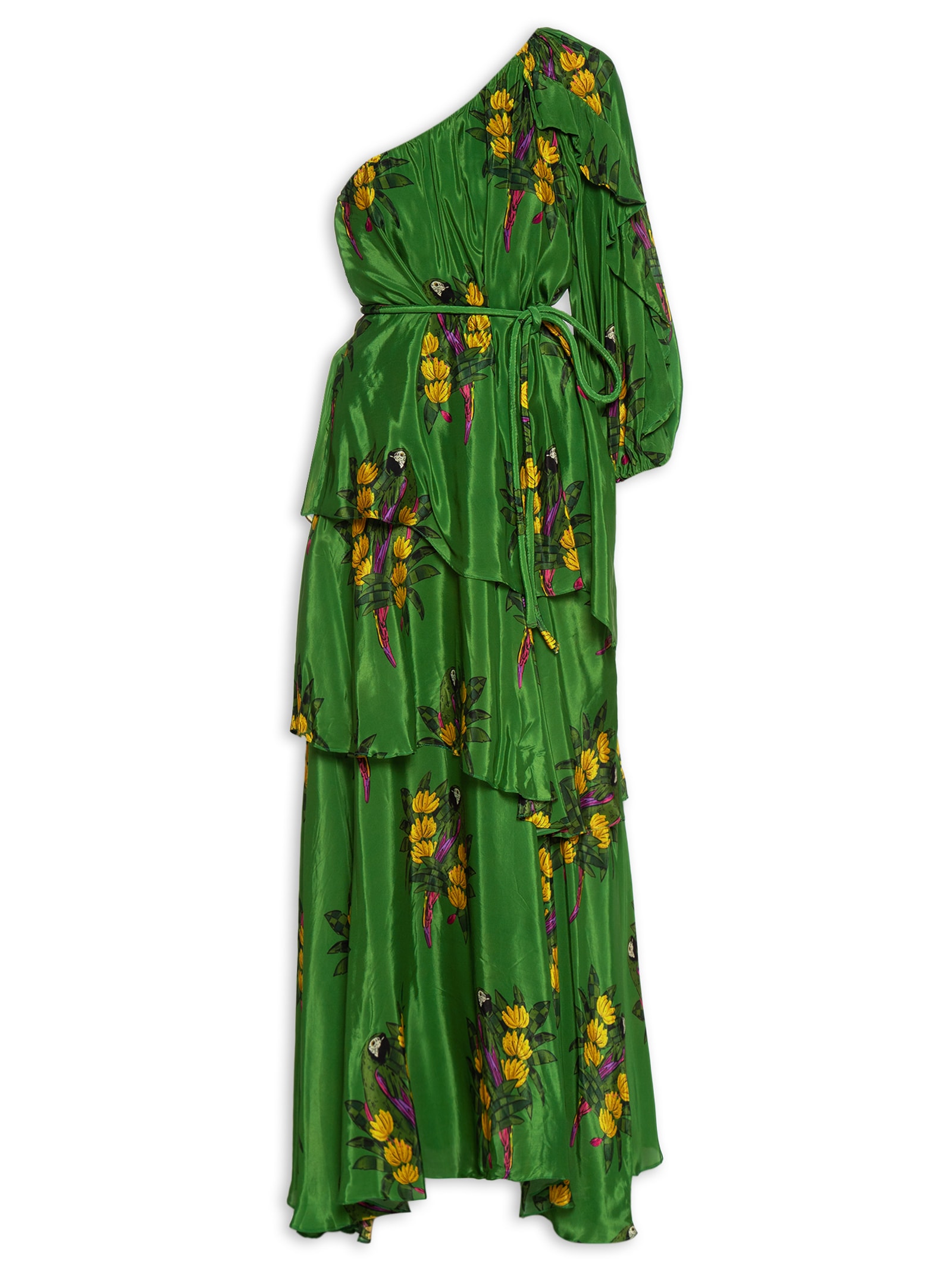 O vestido verde é confeccionado em tecido leve com superfície acetinada sem elasticidade. A peça solta ao corpo possui decote ombro único, manga 7/8 com detalhe de franzido no ombro e babado aplicado, elástico embutido no punho, recortes sobrepostos em camadas, mix de estampa em cores contrastantes, forro, comprimento longo e fechamento lateral por zíper invisível. Acompanha cordão acolchoado na mesma estampa e tecido para uso opcional.