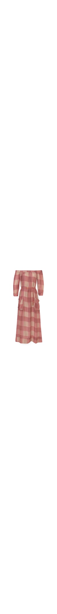 O vestido rosa é confeccionado em tecido leve com toque de seda. A peça possui decote ombro a ombros com elástico embutido, mangas 7/8 com ajuste nos punhos, bolsos frontais, padronagem xadrez vichy em tom contrastante, comprimento longo, shape solto, caimento reto e acabamento pespontado.