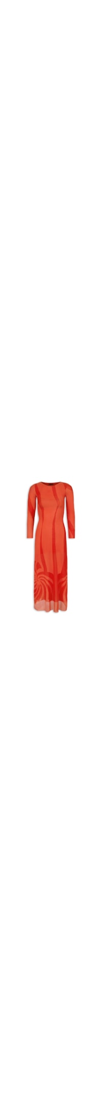 O vestido laranja é confeccionado em tecido leve com alta elasticidade. A peça levemente justa ao corpo possui decote redondo, mangas longas, estampa abstrata em cor contrastante, forro e comprimento longo.