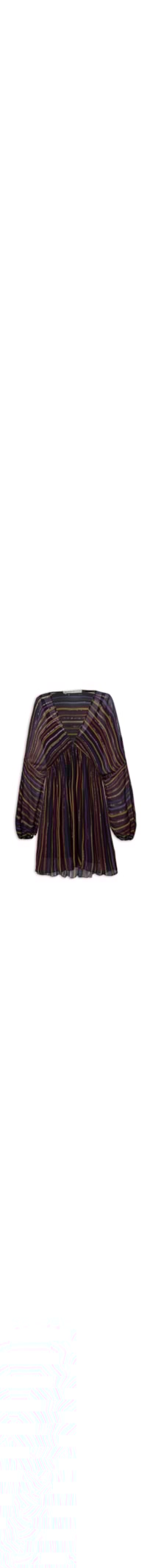 o vestido Preto é Confeccionado Em tecido Leve Sem Elasticidade. A Peça Solta Ao Corpo, Possui Decote Em V, Mangas Longas Amplas Com Elástico Embutido Nos Punhos, Recortes Frontais Com Leve Franzido, Elástico Embutido Na Parte Posterior Da Cintura, Padronagem De Listras Com Fios De Lurex Aplicados Em Cores Contrastantes, Comprimento Curto E Leve Transparência. Acompanha Foto Em Malha Leve De Média Elasticidade, Possui Decote Em V, Alças Finas Reguláveis E Comprimento Curto.