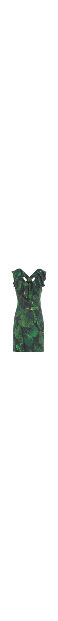 O vestido verde é confeccionado por tecido leve. A peça justa ao corpo possui decote V profundo, alças médias cruzadas na parte posterior, cavas estendidas, babado na parte frontal na altura do decote, estampa de folhagem em tons contrastantes e comprimento curto.