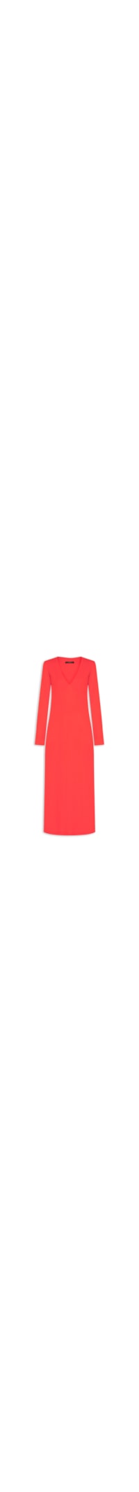 O vestido vermelho é confeccionado em tecido leve com baixa elasticidade. A peça justa ao corpo possui decote V, mangas longas, fenda lateral e comprimento longo.