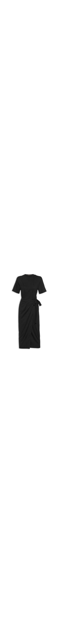 O vestido preto é confeccionado em malha de algodão com média elasticidade. A peça solta ao corpo possui decote redondo, mangas curtas, recortes frontais com detalhe de pespontos, tiras alongadas na altura da cintura para amarração lateral e comprimento midi.