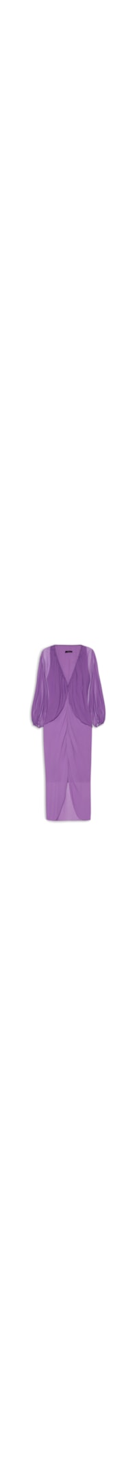 O vestido roxo é confeccionado em tecido leve sem elasticidade. A peça solta ao corpo, possui decote em V profundo com detalhe franzido, mangas longas de modelo morcego com elástico embutido no punho, tecido sobreposto na parte superior com franzido e elástico embutido na parte posterior, recorte vazado frontal, recorte franzido frontal com fenda, leve transparência inferior, comprimento longo, forro curto e fechamento lateral por zíper invisível e colchete.