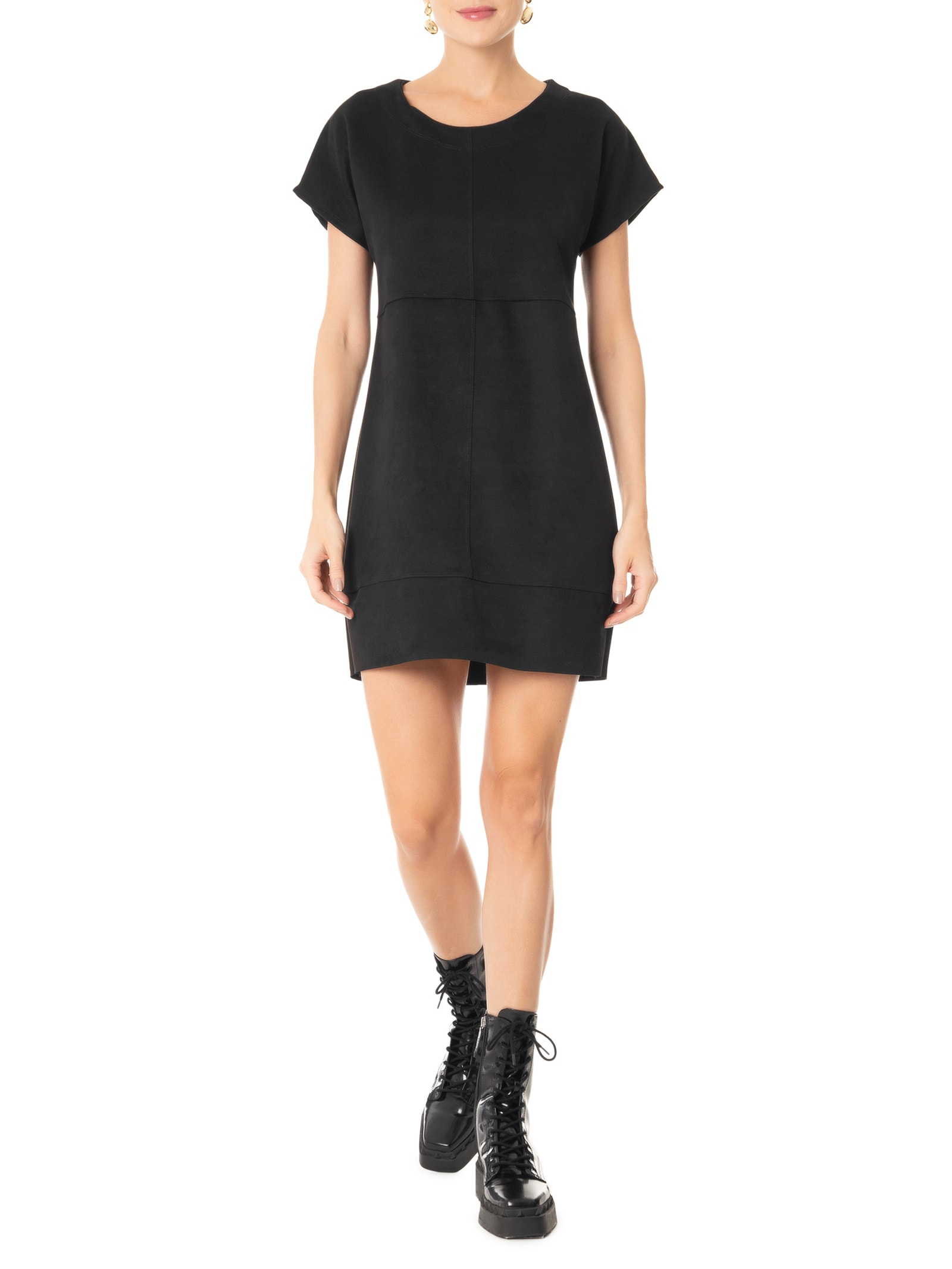 O vestido preto é confeccionado em suede com alta elasticidade. A peça solta ao corpo possui decote redondo, mangas curtas de modelo morcego, recorte posterior e frontais e comprimento curto.