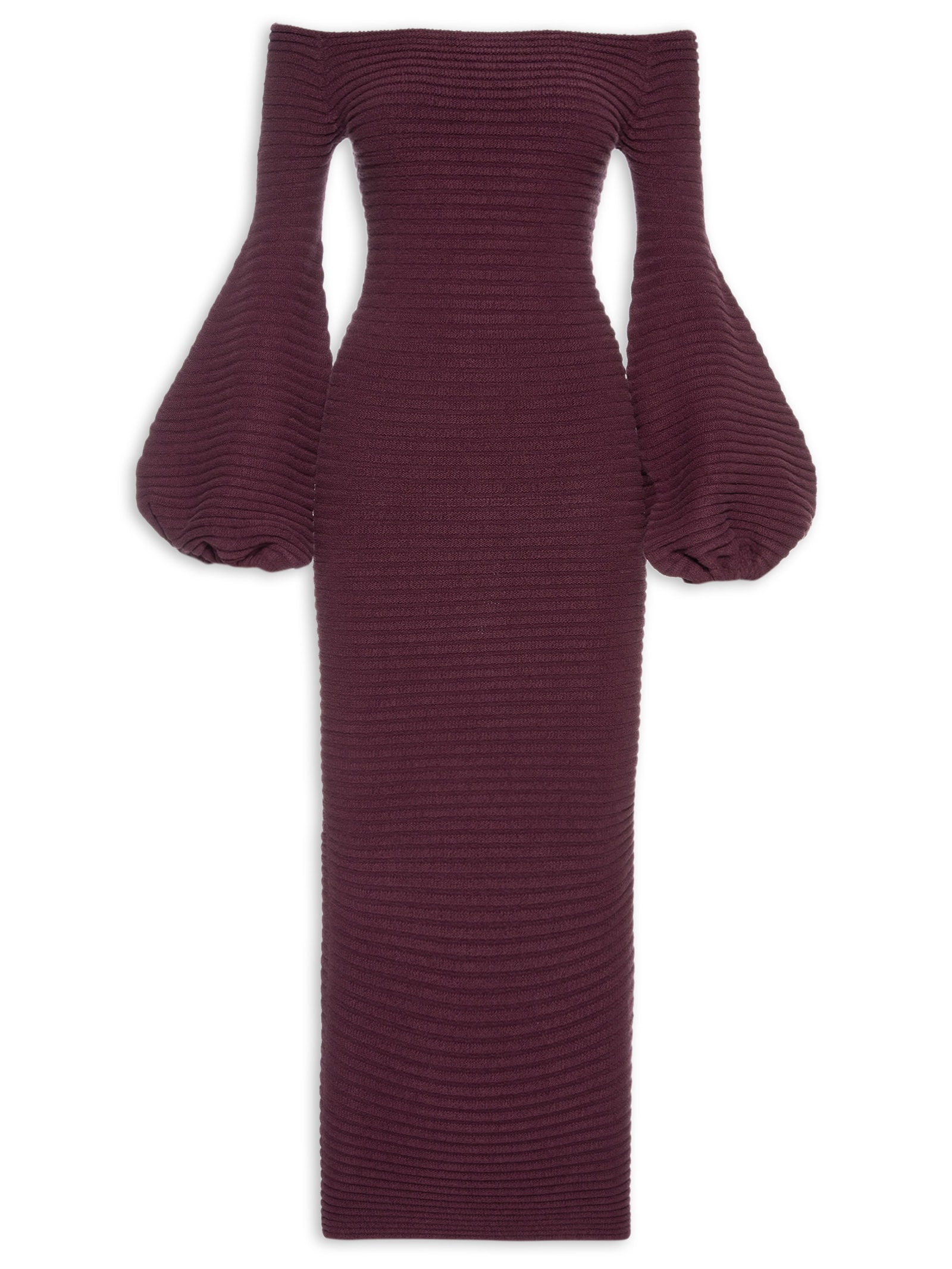 O vestido vinho é confeccionado em tricot com superfície texturizada e alta elasticidade. A peça justa ao corpo possui decote canoa, mangas longas de modelo sino e comprimento midi.