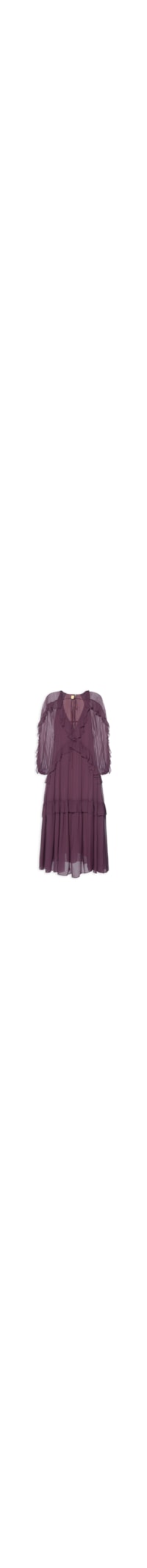 O vestido roxo é confeccionado em tecido leve sem elasticidade. A peça solta ao corpo possui decote V profundo com cordões embutidos na parte frontal, mangas longas amplas, tecidos sobrepostos aplicados ao longo da peça com efeito de babados, comprimento longo e forro.