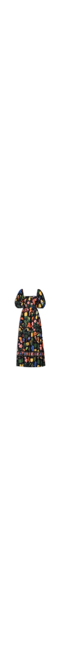 O vestido preto é confeccionado em tecido leve sem elasticidade. A peça justa no busto e solta no comprimento possui decote quadrado com cordão arredondado, recorte posterior em lastex, sem bojo, mangas curtas bufantes, mix de estampas em cores contrastantes e comprimento longo.