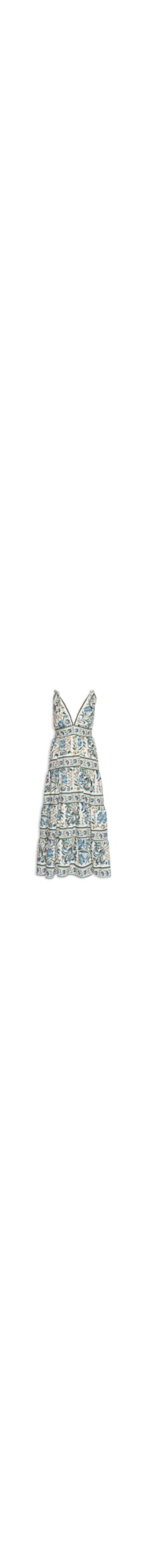 O vestido branco é confeccionado em tecido leve sem elasticidade. A peça solta ao corpo possui decote V, alças médias com amarração, cavas regulares, estampa floral em cores contrastantes, aplicação de passamanaria no decote e nas cavas e comprimento longo.