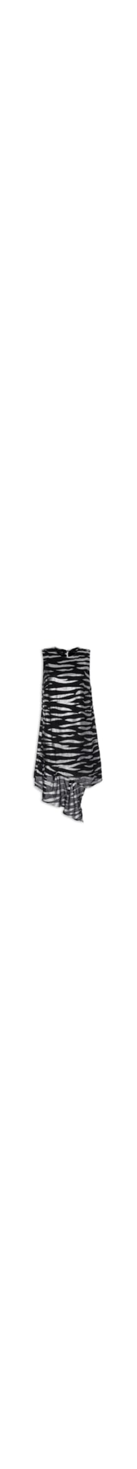 O vestido prateado é confeccionado em tecido leve. A peça possui decote redondo, alças largas, cavas regulares, recorte posterior vazado com botão aplicado, tag da marca aplicada em metal na parte posterior na altura do decote, padronagem listrada em fios de lurex com cor contrastante, recorte frontal na altura da barra com detalhe de pregas e assimetria, comprimento midi e shape solto.