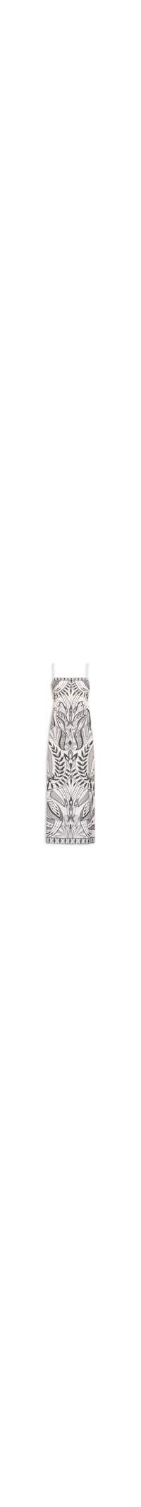 O vestido preto é confeccionado por tecido leve com toque em linho e sem elasticidade. A peça solta ao corpo possui decote reto, alças finas com ajuste, recorte frontal na altura do busto, fendas laterais, recorte posterior em lastex, mix de estampas em cor contrastante e comprimento midi.