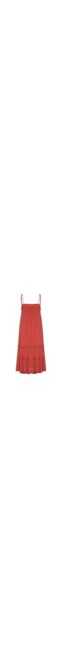 O vestido vermelho é confeccionado em tecido leve sem elasticidade. A peça solta ao corpo possui decote reto, alças finas reguláveis, recortes sobrepostos em camadas no comprimento, forro e comprimento midi.