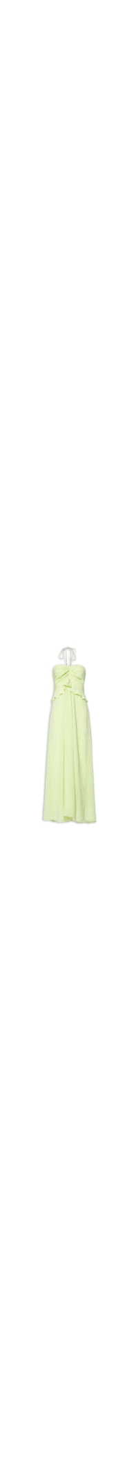 O vestido verde é confeccionado em tecido leve com superfície texturizada e sem elasticidade. A peça justa ao busto e solta no comprimento possui decote reto, alças finas alongadas embutidas na parte frontal para ajuste e amarração posterior, pregas laterais, recorte sobreposto de babados na altura da cintura, leve transparência, forro, sem bojo, comprimento midi e fechamento posterior por zíper invisível.