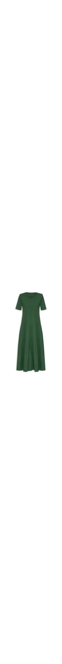 O vestido verde é confeccionado em malha com alta elasticidade. A peça solta ao corpo possui decote redondo, mangas curtas, recortes com detalhes de franzidos e comprimento midi.