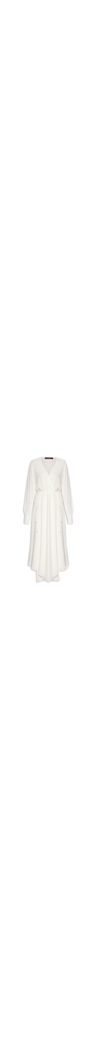 O vestido off white é confeccionado em crepe sem elasticidade. A peça solta ao corpo possui decote V transpassado, mangas longas com abotoamento nos punhos, leve transparência, elástico e cordão embutido na altura da cintura para amarração frontal, recorte frontal transpassado com fenda, assimetria na parte frontal e comprimento midi.