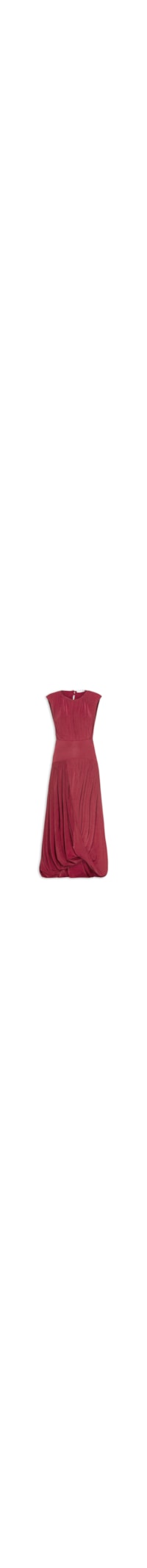 O vestido vermelho é confeccionado em tecido leve com baixa elasticidade. A peça solta ao corpo possui decote arredondado, alças largas, cavas alongadas, recortes na altura da cintura, efeito drapeado, fenda frontal, barra assimétrica em balonê, comprimento midi e fechamento posterior por botões.