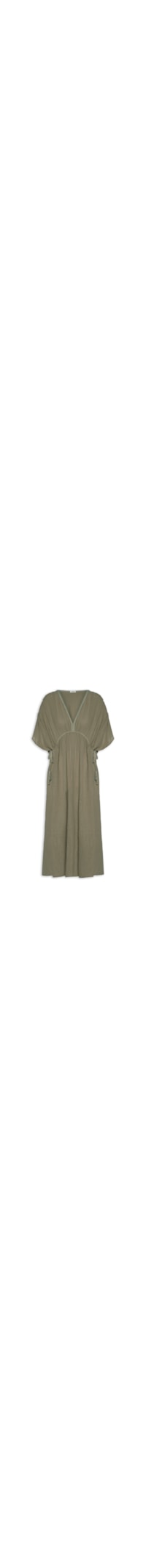 O vestido verde é confeccionada em tecido leve com toque de linho e sem elasticidade. A peça solta ao corpo possui decote em V, mangas 3/4 amplas modelo japonesa com detalhe drapeado, aplicação de tiras finas em tranças, forro e comprimento midi.