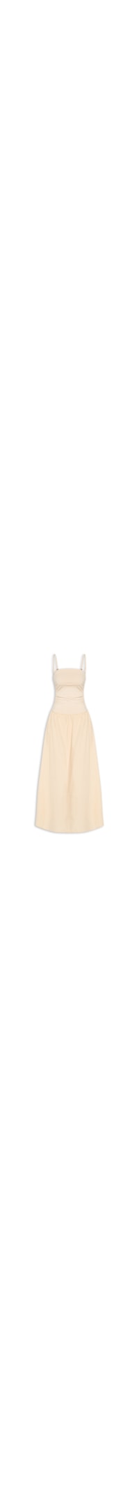 O vestido bege é confeccionado em tecido leve sem elasticidade. A peça justa ao busto e solta no comprimento de modelo tomara que caia possui decote reto alças finas opcionais, elástico embutido nas laterais com efeito franzido, recorte na altura do quadril em malha e comprimento midi.