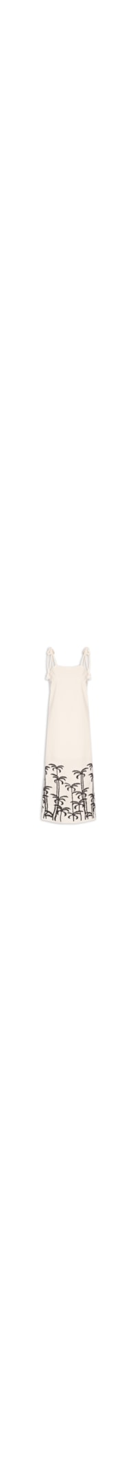 O vestido off white é confeccionado em tecido leve sem elasticidade. A peça solta ao corpo possui decote reto, cavas estendidas, alças finas alongadas em cordão trançado regulável por amarração, decote reto posterior, meio forro, comprimento midi, bordados na barra em cores contrastantes e fendas laterais.