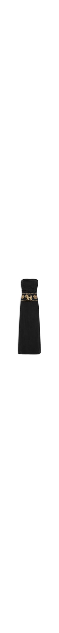 O vestido preto é confeccionado em tecido leve com superfície texturizada e sem elasticidade. A peça justa ao busto e solta no comprimento de modelo tomara que caia possui decote reto, efeito drapeado na parte superior, lastex aplicado na parte posterior, aplicação de bordado paisley e figurativo de elefantes em tom metalizado na altura da cintura, fendas laterais, forro curto e comprimento midi.