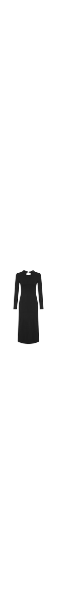 O vestido preto é confeccionado em malha com superfície texturizada e média elasticidade. A peça justa ao corpo possui decote redondo, mangas longas, recorte posterior vazado, fenda posterior, comprimento midi e fechamento posterior por botão.