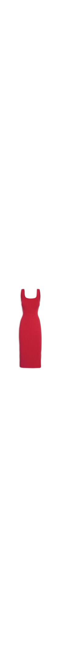 O vestido vermelho é confeccionado em tricot canelado com alta elasticidade. A peça justa ao corpo possui decote posterior e frontal U, alças médias, cavas estendidas e comprimento midi.